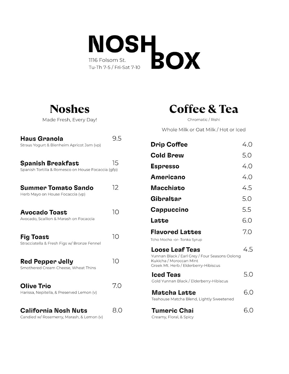 Located at 1116 Folsom St in the vibrant SoMa district, The Nosh Box is not just another café; it's a delightful culinary oasis celebrated for its thoughtful approach to comfort food and artisanal coffee. An enchanting blend of café and wine bar, The Nosh Box crafts a unique atmosphere where the charm of homemade goodness meets the sophisticated flair of urban dining.